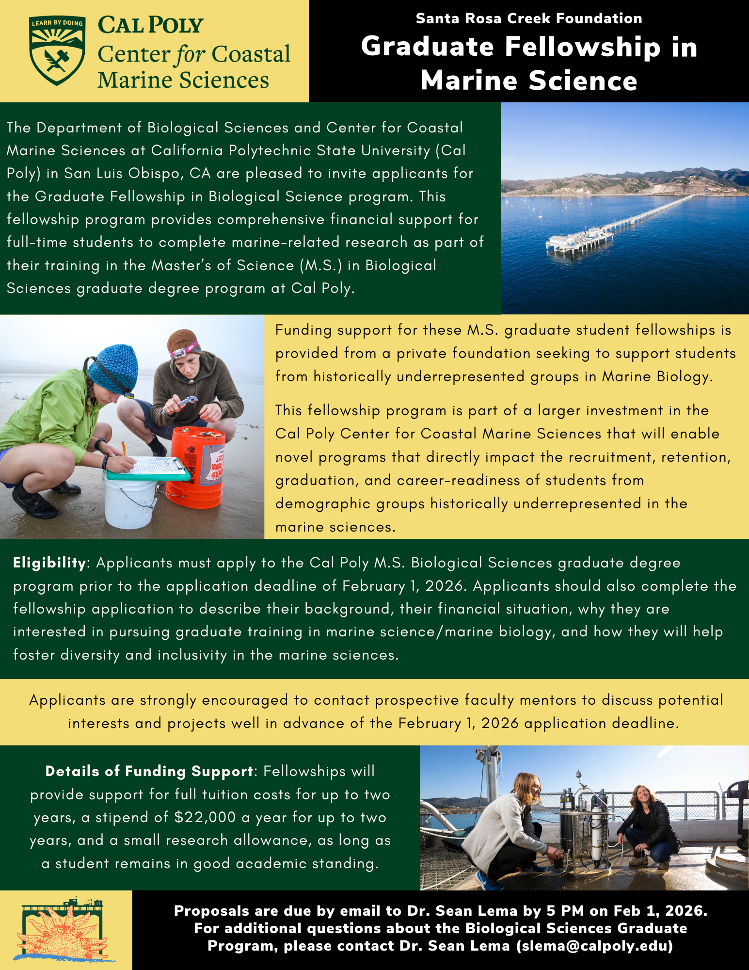 The Santa Rosa Creek Foundation provides two years of graduate tuition and fees, plus stipend, for new graduate students each year (2021-2029). Preference will be given to students with high financial need who attended high school in target California counties (Fresno, Kern, Kings, Monterey, San Luis Obispo, Santa Barbara & Tulare).